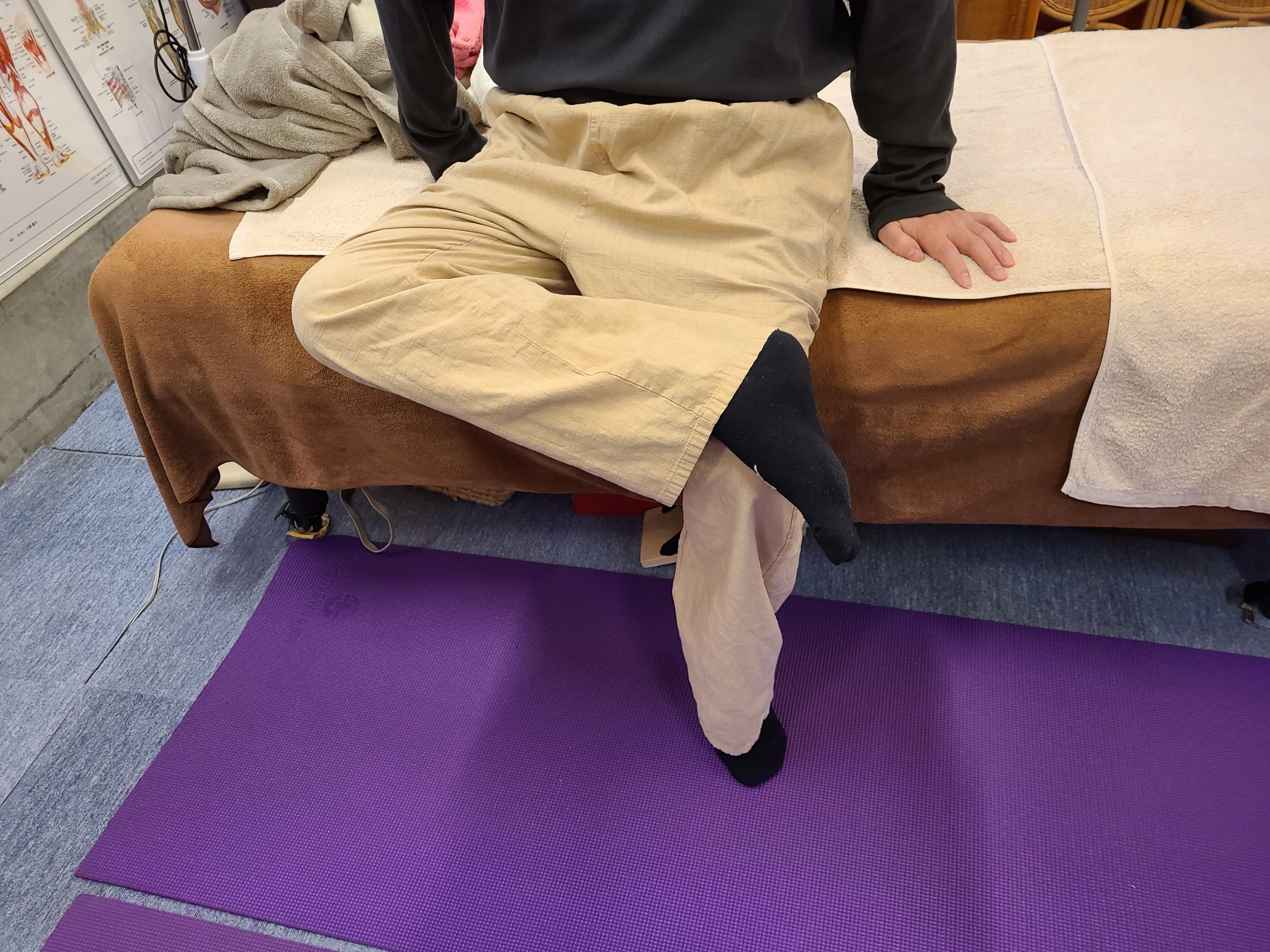 観察すると右下肢全体が硬く硬くなってきています。今回は丁寧にほぐします。ポイントとなる箇所がいくつかありましたが、普通に正座はできるようになったようですので、ご自分でできるほぐし方をお教えして終わりました。これでしばらくは大丈夫でしょう。