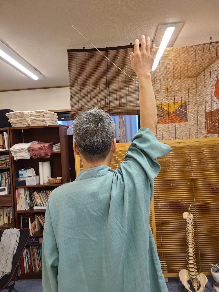 観察すると肩・上腕の筋肉が硬直していましたので緩めたら簡単に痛みは取れました。