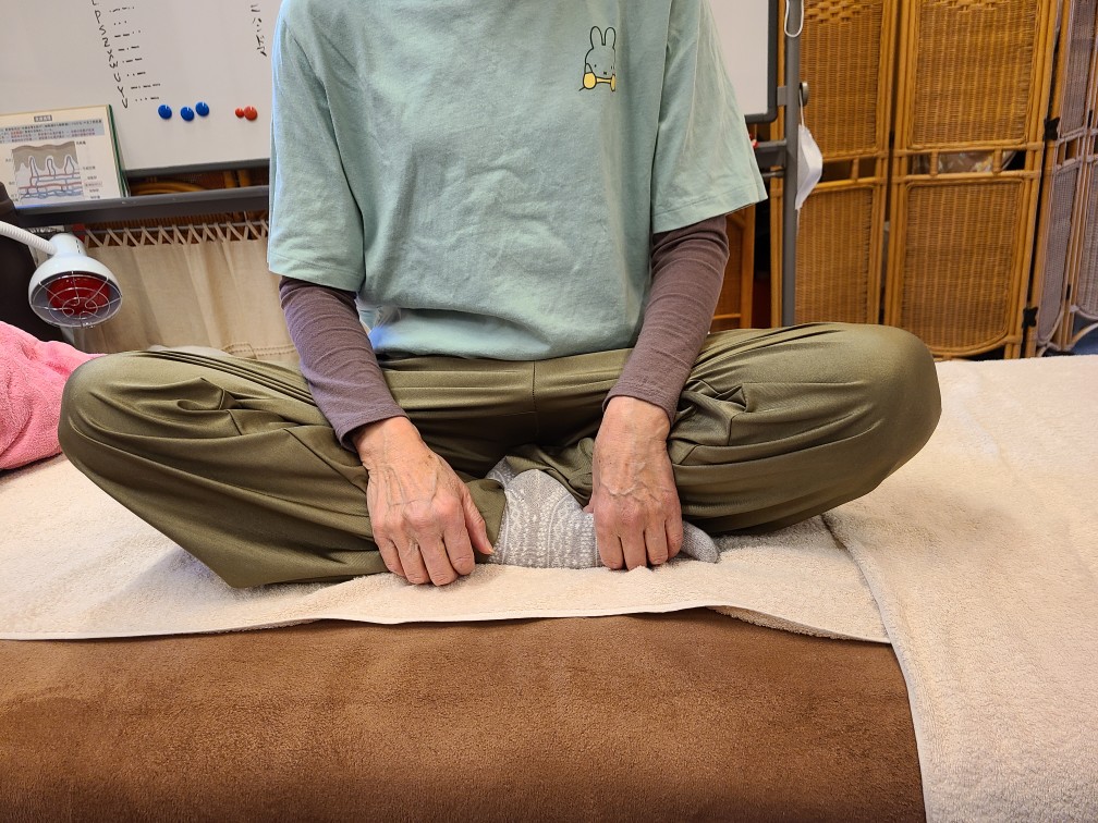 観察すると右下肢全体が硬く硬くなってきています。今回は丁寧にほぐします。ポイントとなる箇所がいくつかありましたが、普通に正座はできるようになったようですので、ご自分でできるほぐし方をお教えして終わりました。これでしばらくは大丈夫でしょう。